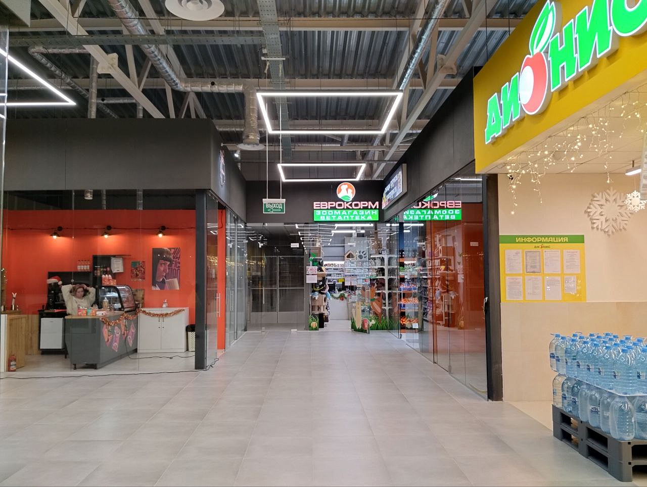 Просторный магазин в торговом центре с полным ассортиментом товаров для питомцев.