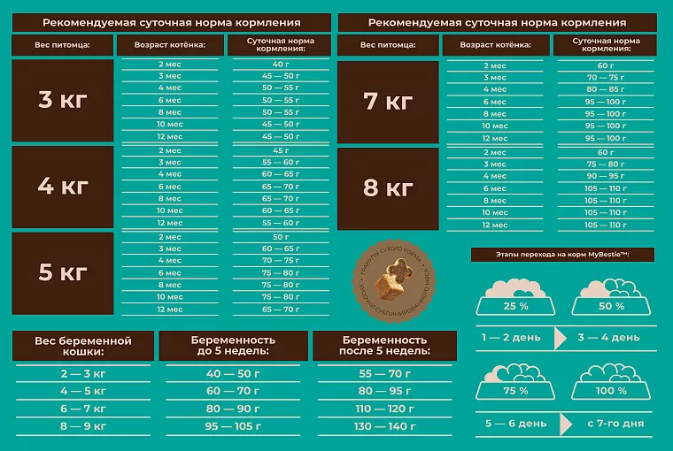 Правильная норма кормления помогает котёнку получать все необходимые вещества для роста без перегрузки организма. Постепенный переход на MyBestie позволяет малышу легко привыкнуть к новому рациону и сохранить здоровье пищеварения.