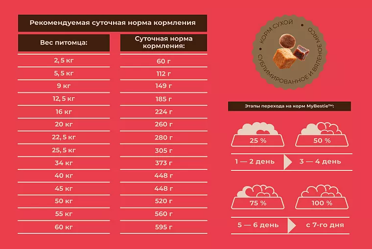 Правильная норма кормления помогает вашей собаке получать всё необходимое без перегрузки организма. Постепенный переход на MyBestie позволяет питомцу легко привыкнуть к новому рациону и сохранить здоровье пищеварения.